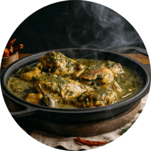 Boneless chicken cooked in fresh garlic, ginger and rich cashew nut sauce with fenugreek leaves