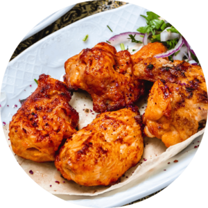 Boneless chicken breast marinated in garlic, ginger, pickle spices and grilled in tandoor to perfection